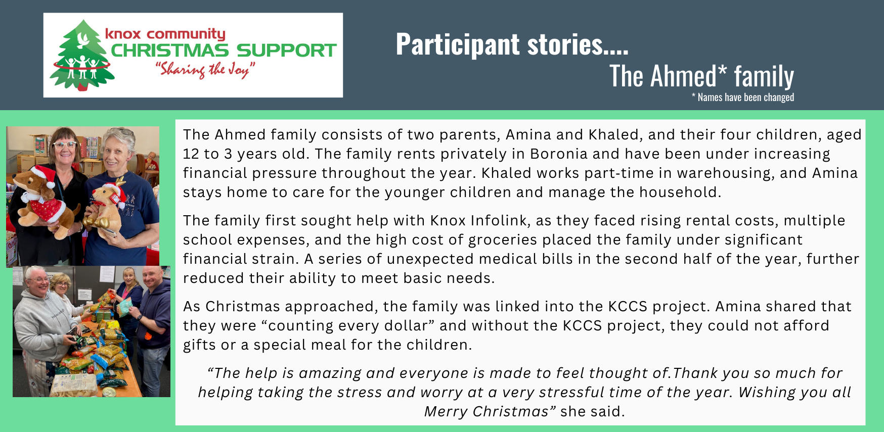 For over 16 years, the annual KCCS project has implemented a whole of community approach to ensure everyone in Knox City has some festive food, and every parent/carer has a gift for their child(ren), to celebrate the Christmas season.