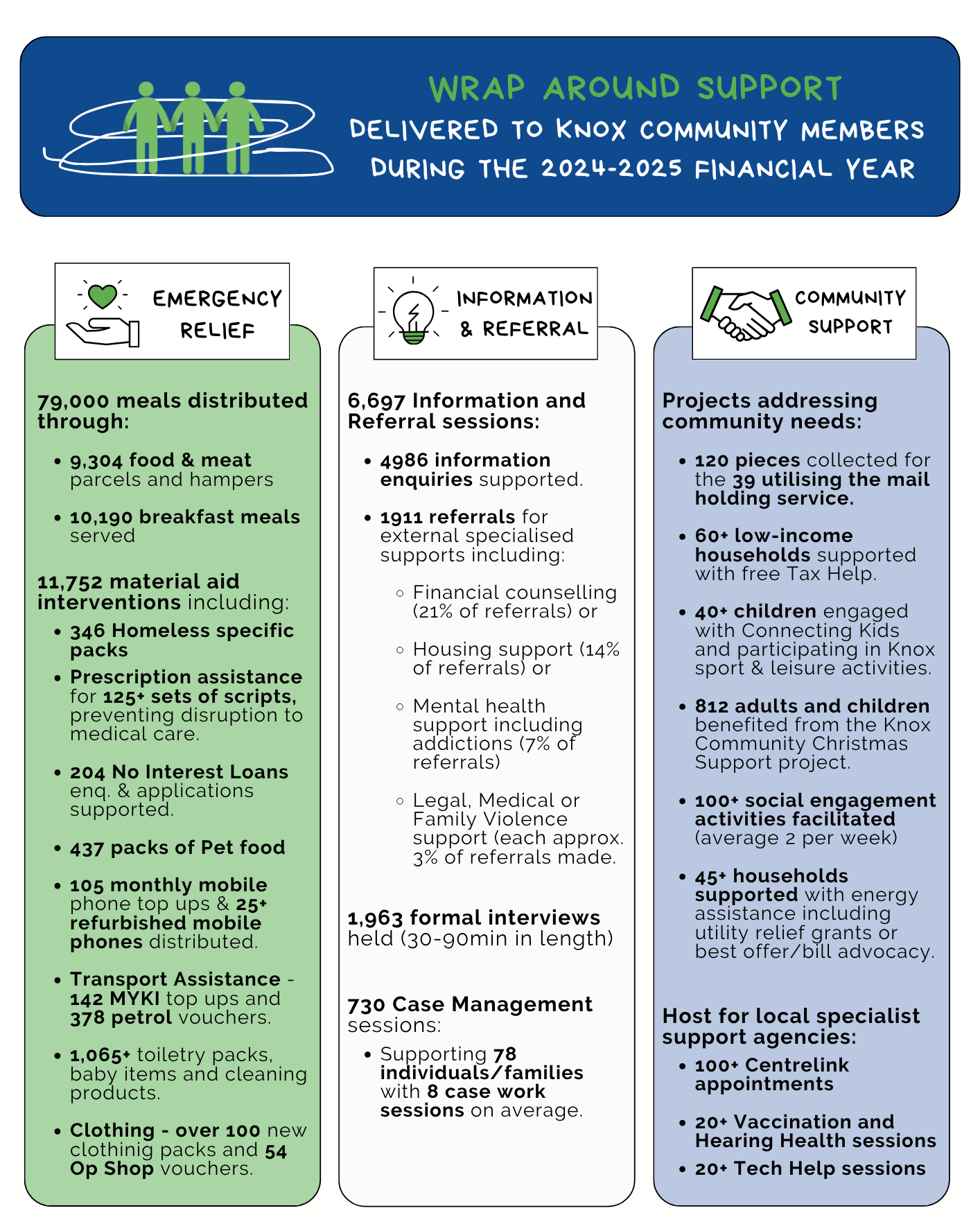 Knox Infolink delivers a unique two-entry point service model enabling people facing crisis in Knox to find immediate support and help.